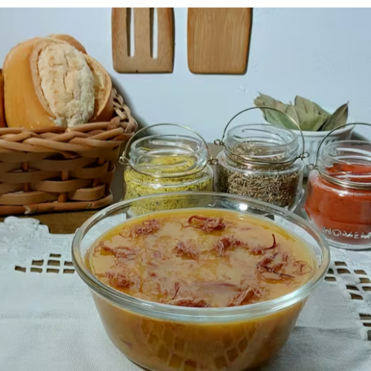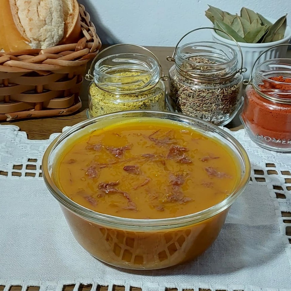 Esse caldo é preparado com abóbora cabotiã para sua base e temperos caseiros juntando-se a carne seca cozida e desfiada.