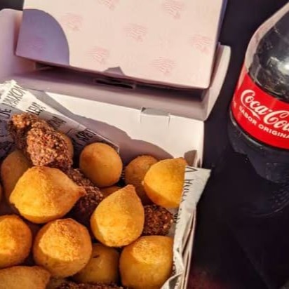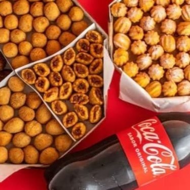 Salgados variados e recheados, 10 churros no sabor que você escolher (chocolate ou doce de leite) e uma Coca-Cola 200ml. Um combo saboroso e prático!
