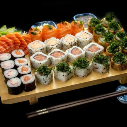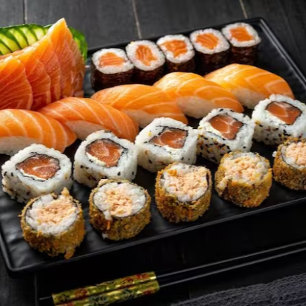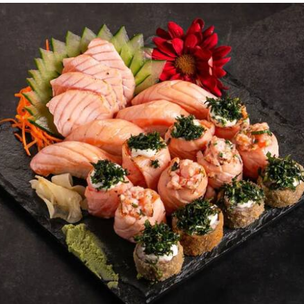 3 temaki a sua escolha .18 sashimis salmão .36 sushis variados .3 salmão grelhado .3 mini porção de shimeji .6 guiozas de carne bovina .3 rolinhos de queijo .3 rolinhos de legumes