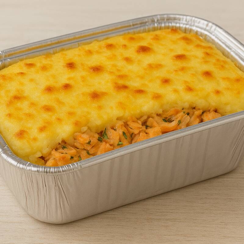 Delicioso escondidinho de salmão, preparado com purê de batatas cremoso, recheado com lascas de salmão douradas no azeite e temperadas com ervas finas. Finalizado com camada gratinada que derrete na boca! Uma marmita de 500 ml cheia de sabor, frescor e leveza, perfeita para quem ama uma refeição saudável e sofisticada. 🧡🐟