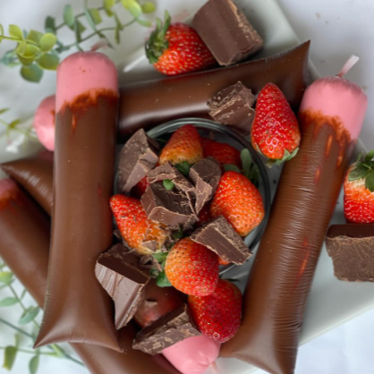 Creme branco com pedaços de morango frescos, finalizado com brigadeiro ao leite. Frescor e doçura em harmonia.