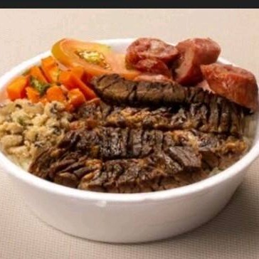Marmitex de churrasco misto! Feijão, arroz, macarrão, farofa, linguiça e carne assada na brasa