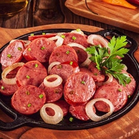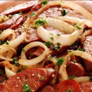 Marmitex de calabresa acebolada! Arroz, feijão, farofa da casa,calabresa defumada cortada em fatias e acebolada