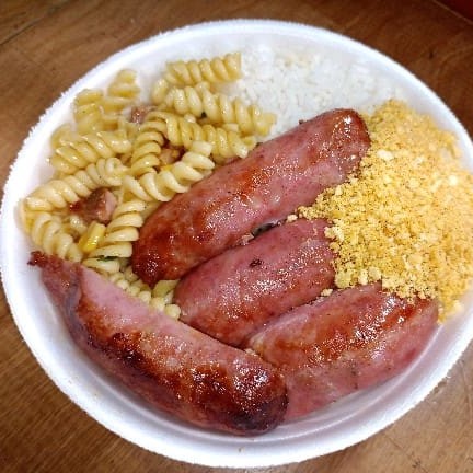 Arroz, feijão macarrão duas línguicas Toscana assadas na brasa