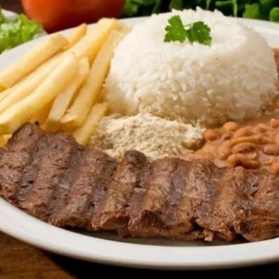 Filé de frango marinado no tempero da casa. Acompanha, arroz,feijao. Serve uma pessoa.