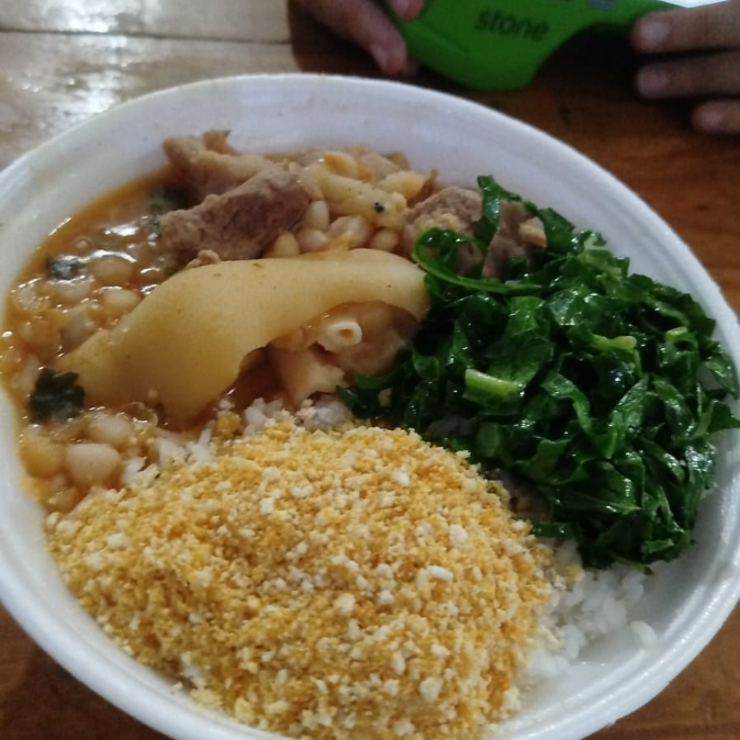 Feijão branco, bacon, linguiça, lombo, costelinha ,pé, acompanha arroz ,farofa da casa e couve.