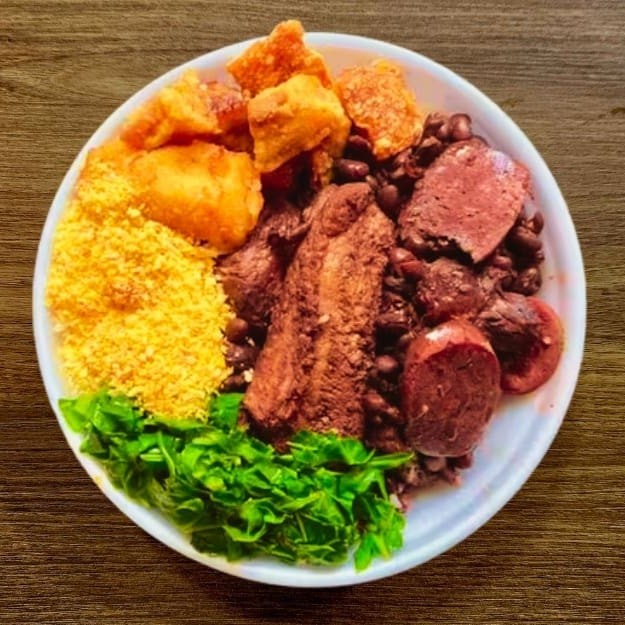 Arroz, feijoada, farofa, couve refogada e torresmo (não acompanha partes grossas)