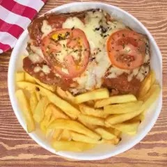 Parmegiana de Frango acompanha arroz, feijão, farofa e fritas