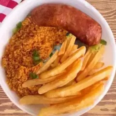 Linguiça Toscana Marmita, arroz, feijão, farofa e Batata frita.