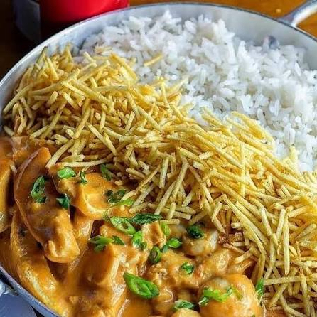 Marmita de estrogonofe de frango +batata palha Acompanha Arroz e batata palha Refri 200ml grátis