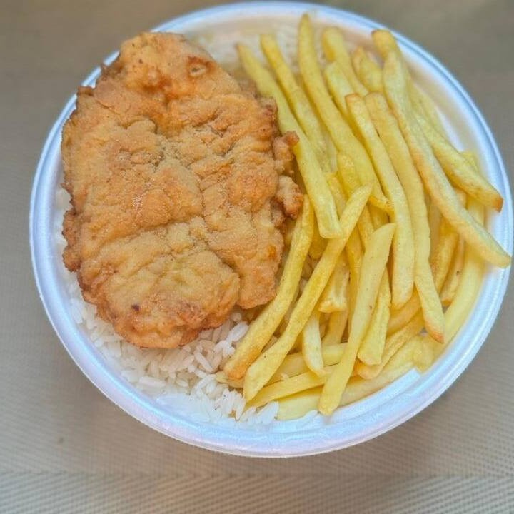 Marmitex File de Frango com Fritas Acompanha Arroz feijao e fritas Coca cola de 200 ml gratis