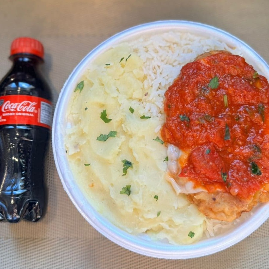 Marmita com delicioso filé de frango parmegiana (empanado na massa crocante coberto com molho de tomates e queijo) acompanhado de arroz branco e purê de batatas inglesas. Acompanha refrigerante pet Coca Cola bem gelado. Marmita indicada para 01 pessoa.