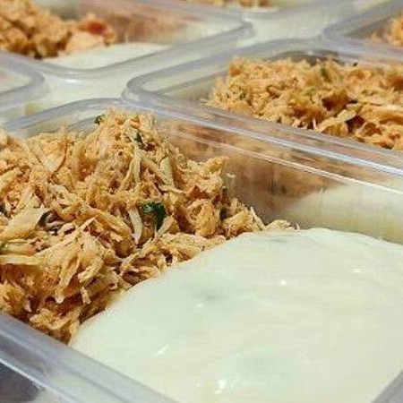 Marmita congelada de frango desfiado, arroz integral e pure de batata doce