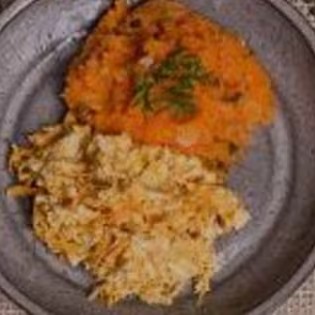 Marmita congelada 300g com purê de batata doce e carne moída e mix de legumes e arroz integral Serve 1 pessoa