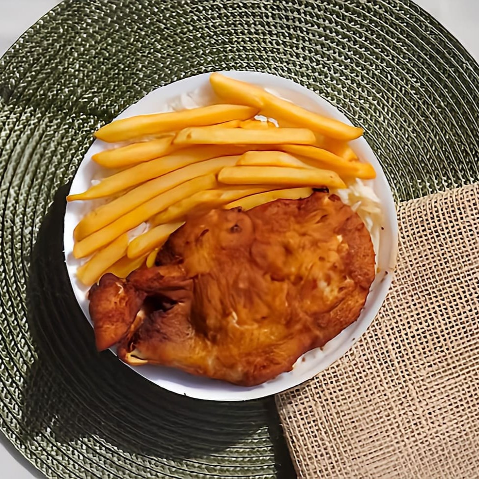 Acompanha arroz, feijão e fritas. Marmitex de 550g para 1 pessoa.