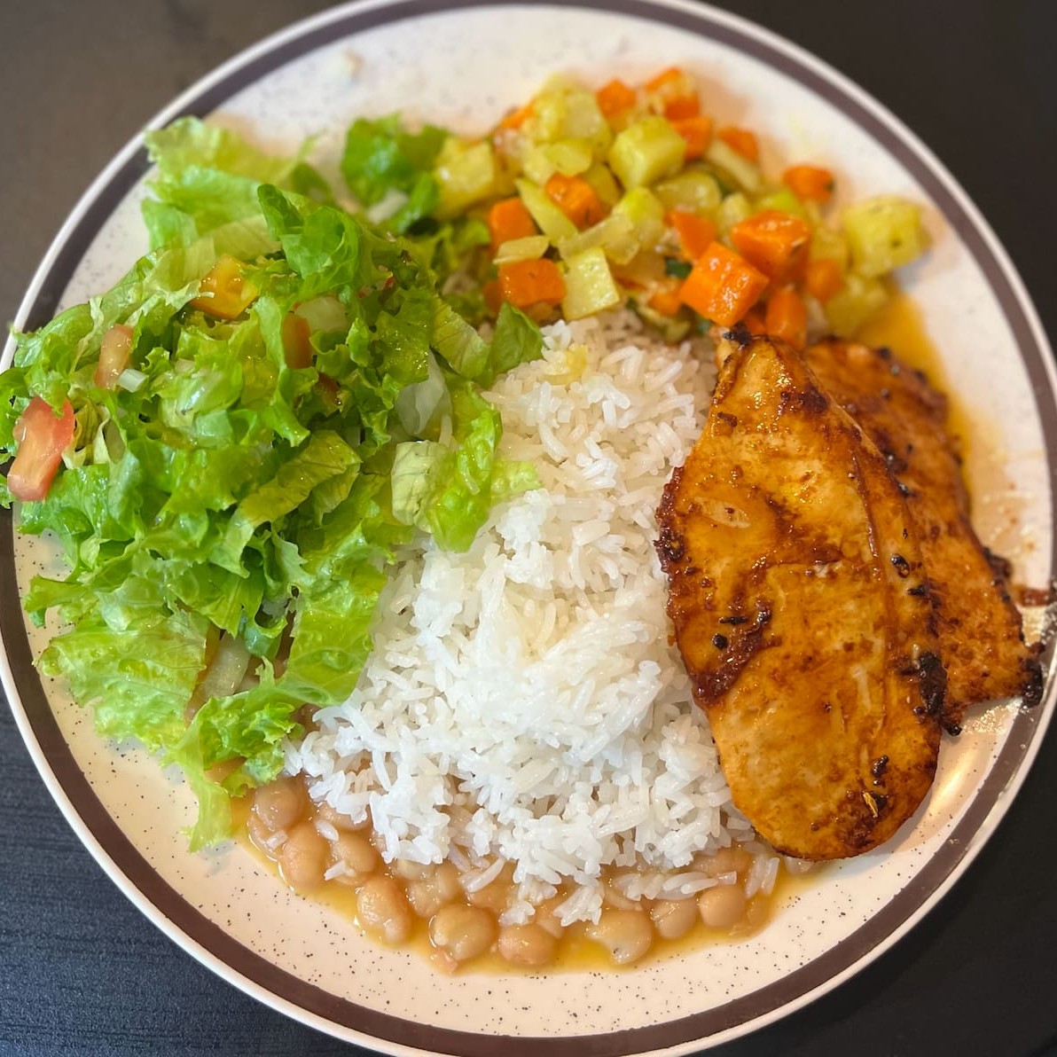 Delicioso e suculento filé de frango acompanhado de arroz e feijão e crocantes batatas fritas.