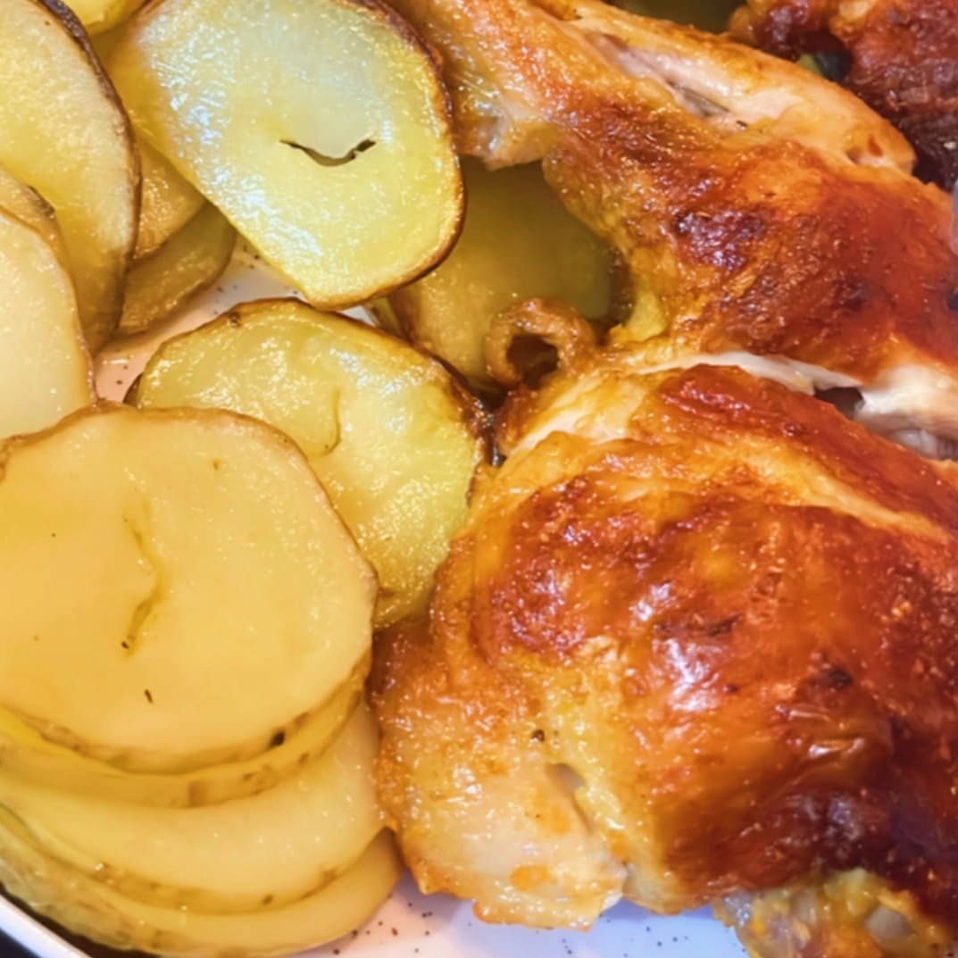 Deliciosa coxa e sobrecoxa assada , acompanhada de um delicioso purê de batata cremoso e caseiro com uma combinação perfeita de farofa. (acompanha arroz e feijão).