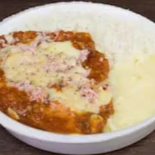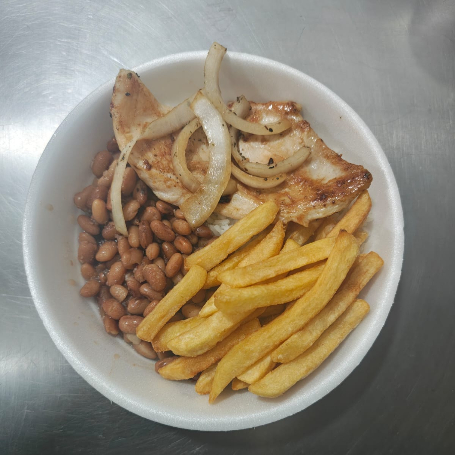 Peito de frango grelhado, salada (alface, tomate e cebola).