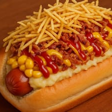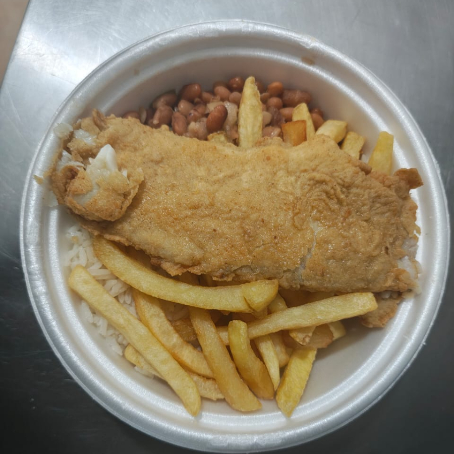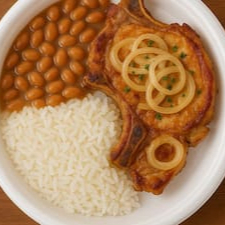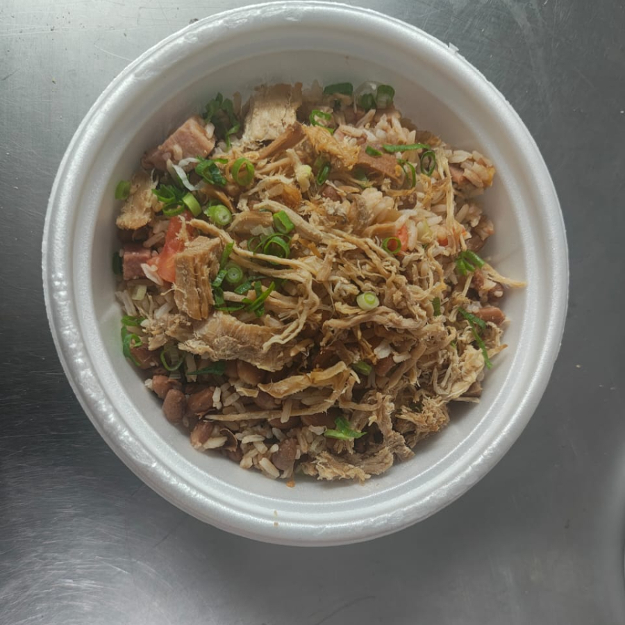 Feijoada completa com feijão preto, carne-seca, linguiça calabresa, Lombo Suíno, servida com arroz branco, farofa, couve refogada e Torresmo.