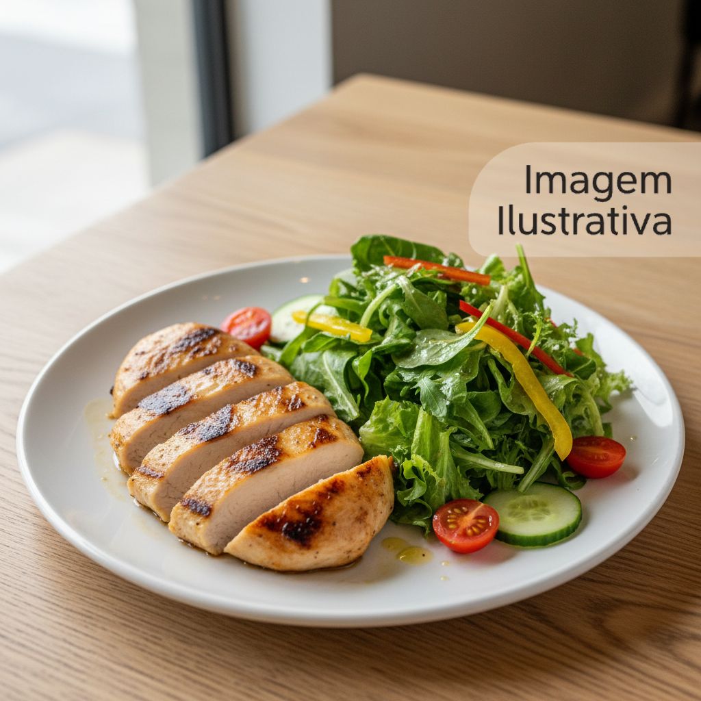 Peito de frango grelhado, salada (alface, tomate e cebola).