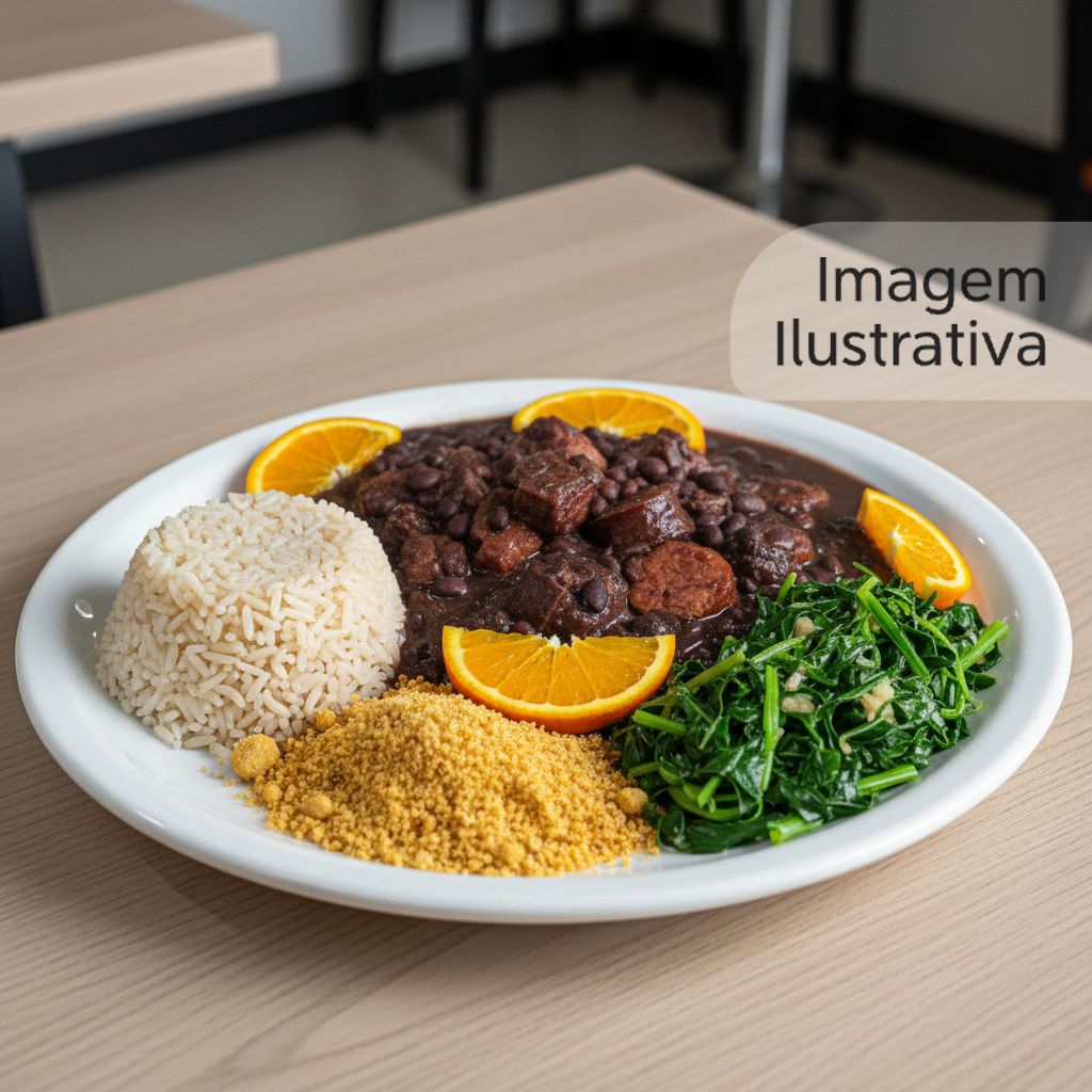 Feijoada completa com feijão preto, carne-seca, linguiça calabresa, Lombo Suíno, servida com arroz branco, farofa, couve refogada e Torresmo.