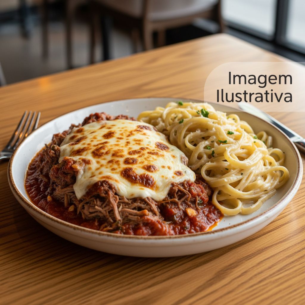 Suculento bife à parmegiana com molho de tomate fresco e queijo mussarela derretido, acompanhado de arroz e batata fritas aproximadamente 500 a 600 grama