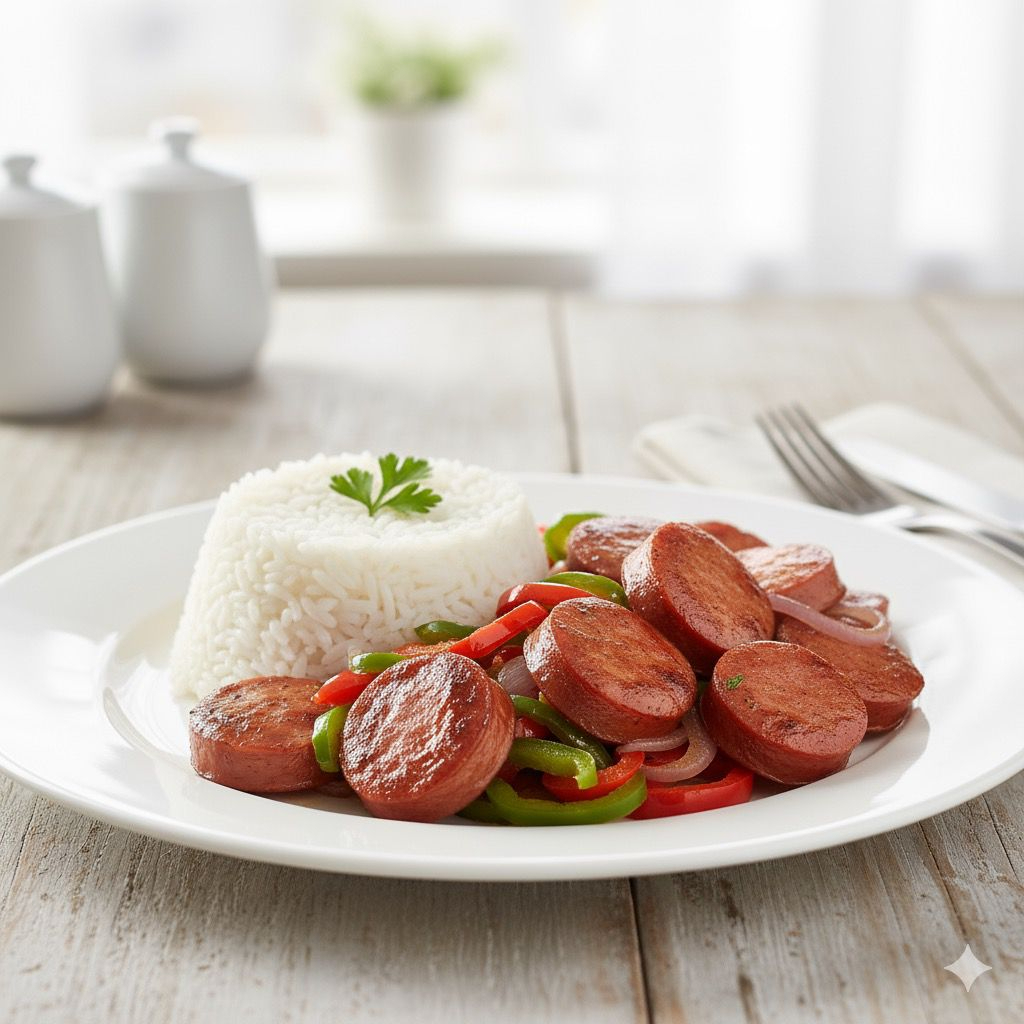 Calabresa acebolada, arroz e feijão