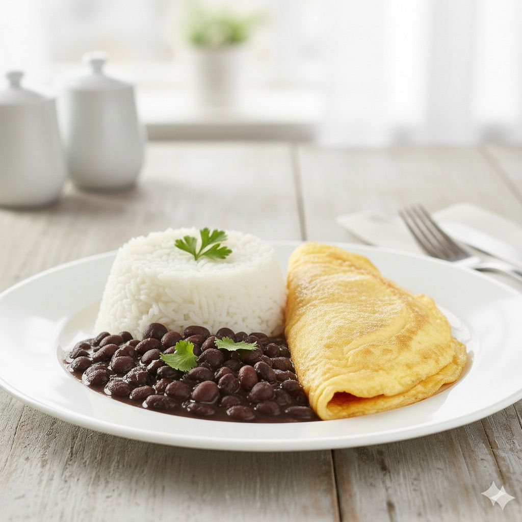 Omelete, arroz e feijão e pure