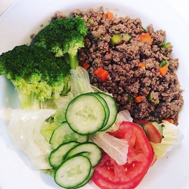 Carne moida refogada e salada(alface, tomate, pepino, cenoura ralada e beterraba ralada