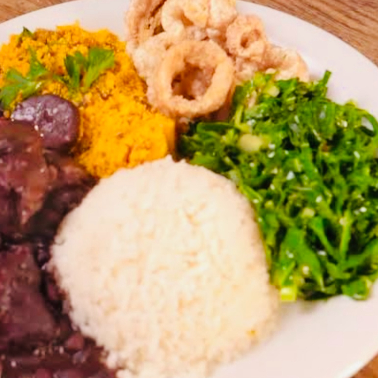 Arroz,feijão,farofa e frango frito com alho e oleo