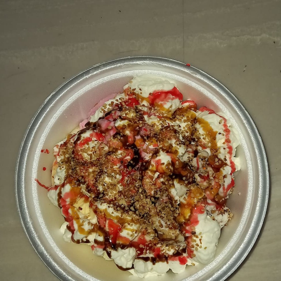 Banana com 3 bolas de sorvete(escolher sabores)chamtili e caldo de sorvete