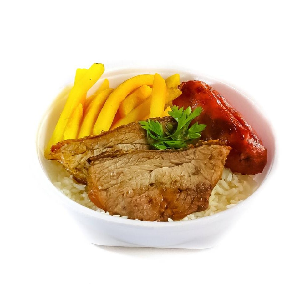 Carne, linguiça e frango, acompanha Arroz, feijão e batata frita