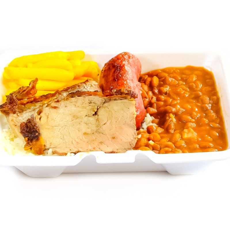 Carne e linguiça, acompanha Arroz, feijão e batat frita