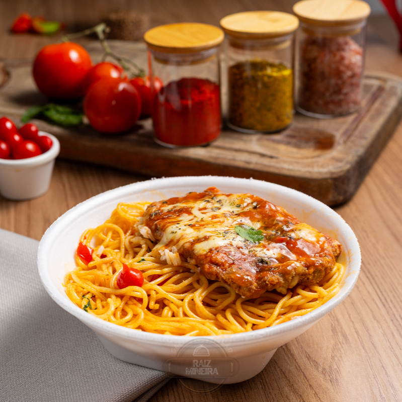 Macarronada do dia com uma suculenta Parmegiana de Frango