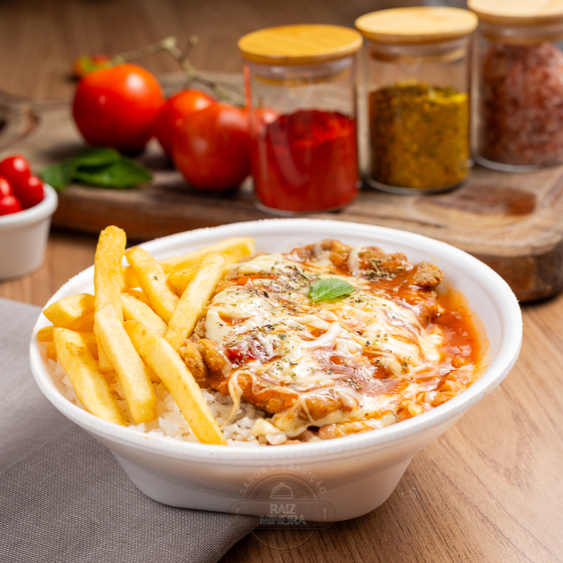 Delicioso filé de frango a parmegiana acompanhado com arroz fresquinho e batata frita.
