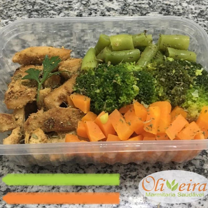 Suculenta marmita com iscas de frango temperadas com ervas finas, legumes selecionados cozinhados no vapor (brócolis, vagem e cenoura) - contém de 260g a 270g