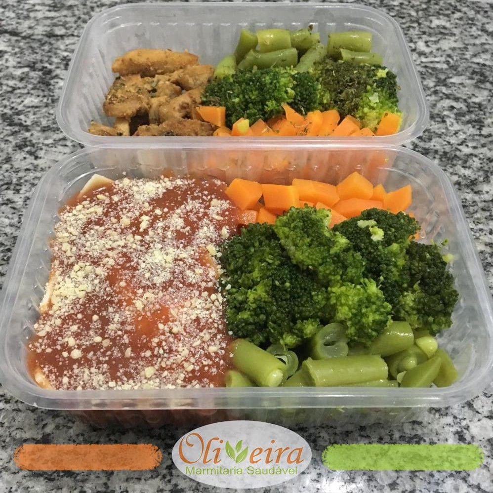 Suculenta marmita de iscas de frango temperadas com ervas finas coberta com mussarela light e molho vermelho, legumes selecionados cozinhados no vapor (brócolis, vagem e cenoura) - contém de 300g a 330g