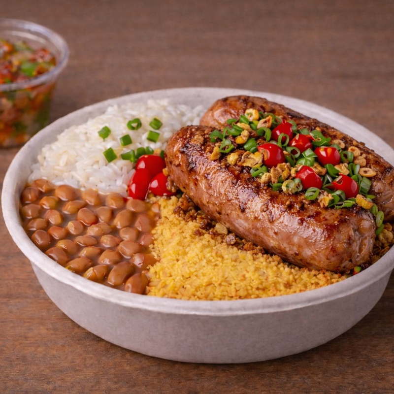 Delicioso e suculento, arroz branco, feijão fresquinho, farofa crocante e vinagrete, finalizado com alho frito, pimenta biquinho e cebolinha.