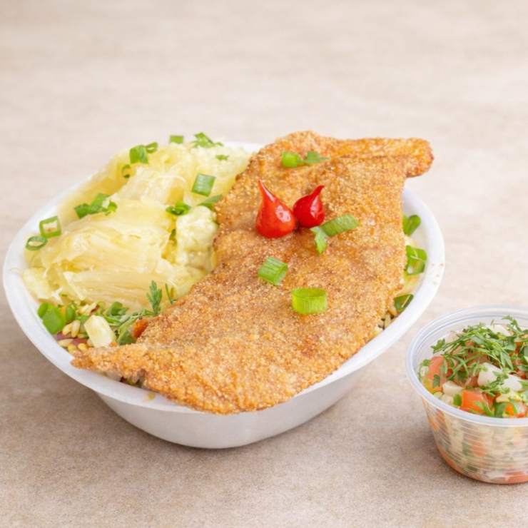 file de frango empanado, servido com molho de tomate da casa, muito queijo derretido, arroz branco e fritas. finalizado com cebolinha e pimenta biquinho ( indicado para 1 pessoa)