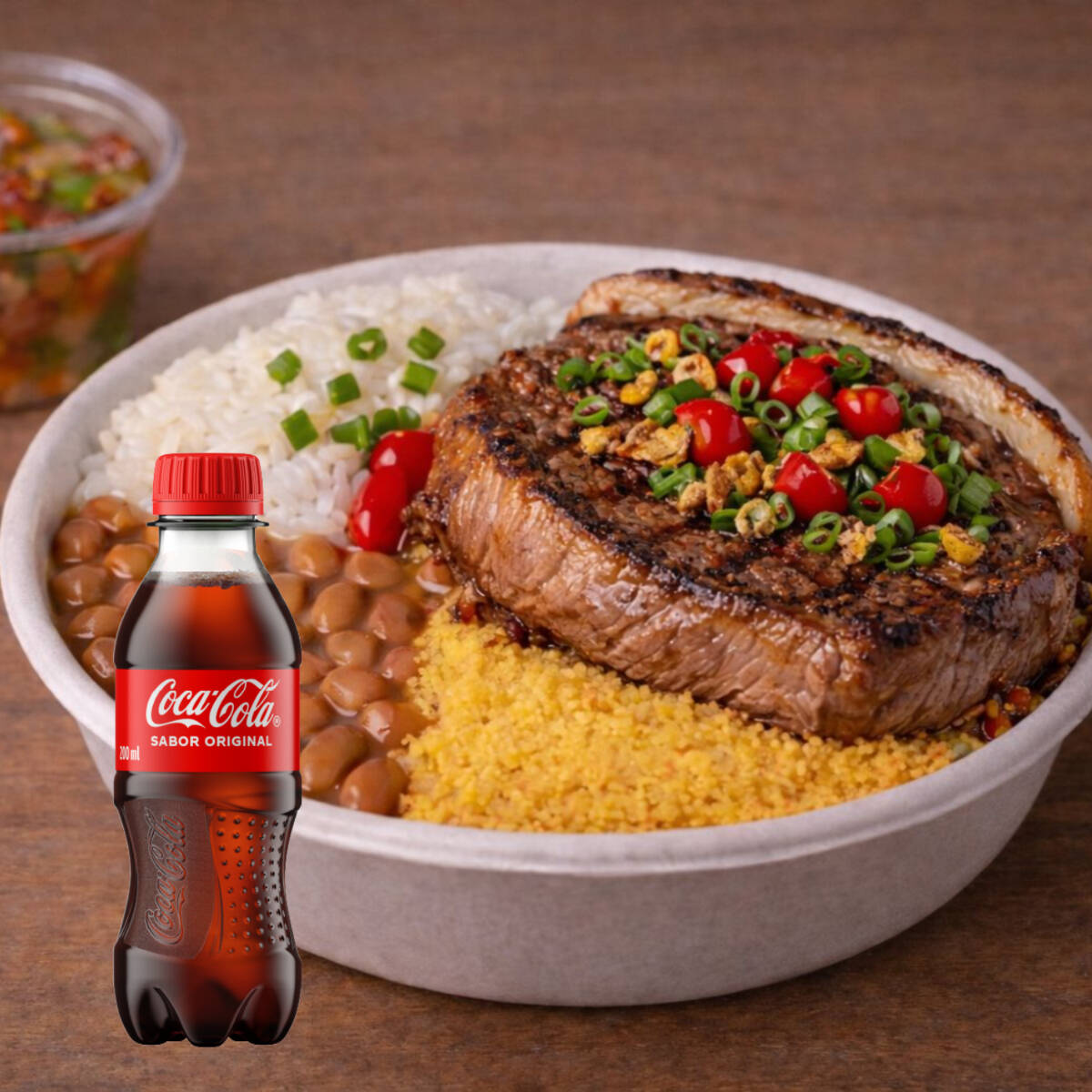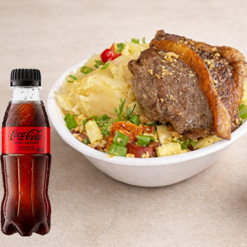 Delicioso bife de contra file, arroz branco, feijão fresquinho, farofa crocante e vinagrete, finalizado com alho frito, pimenta biquinho e cebolinha. + 1 refri guaraná 200ml TOTALMENTE GRÁTIS