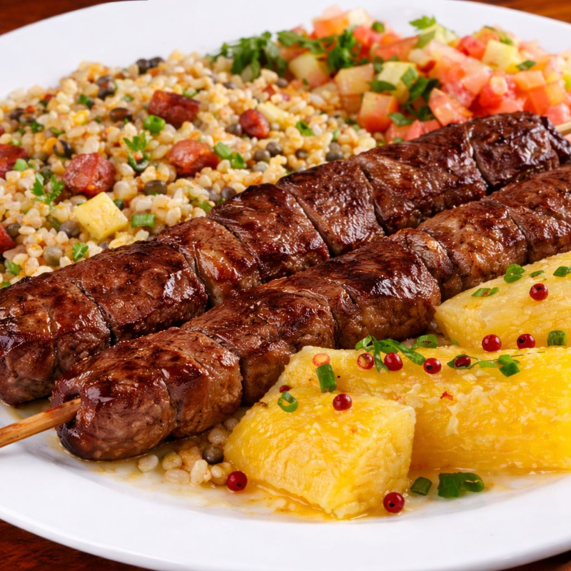 Prato tradicional de fim de tarde dos paulistano, servido com arroz de baião de dois, mandioca cozida e frita na manteiga e vinagrete, acompanhado de 2 espetinhos a sua escolha.