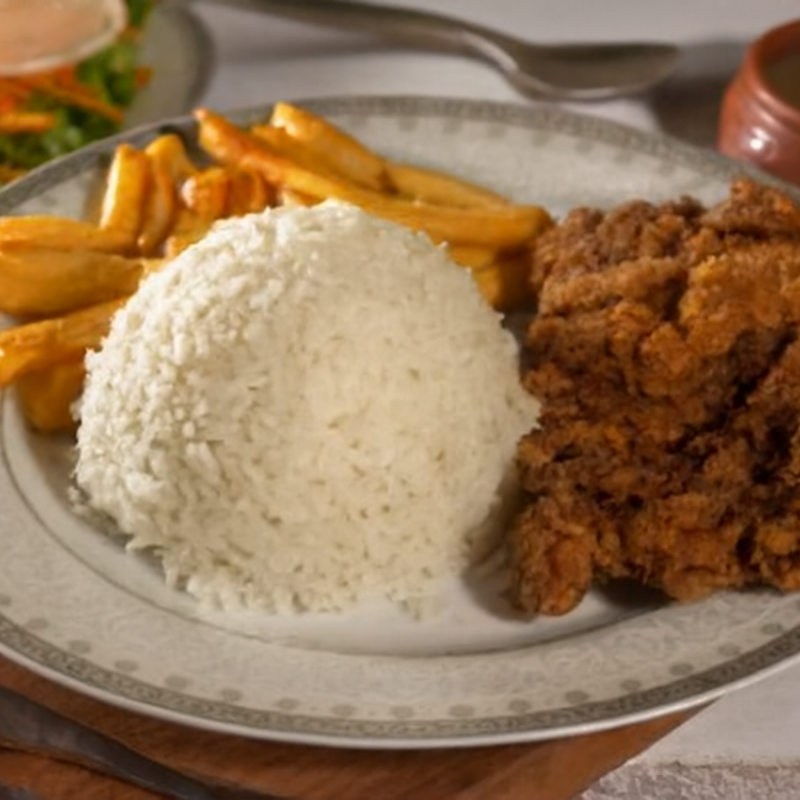O Marmitex Contra Filé à Milanesa é feito com contra filé empanado e crocante, macio por dentro e dourado por fora. Acompanha arroz soltinho, feijão caseiro, salada fresca e batatas fritas crocantes. Uma refeição clássica e saborosa.