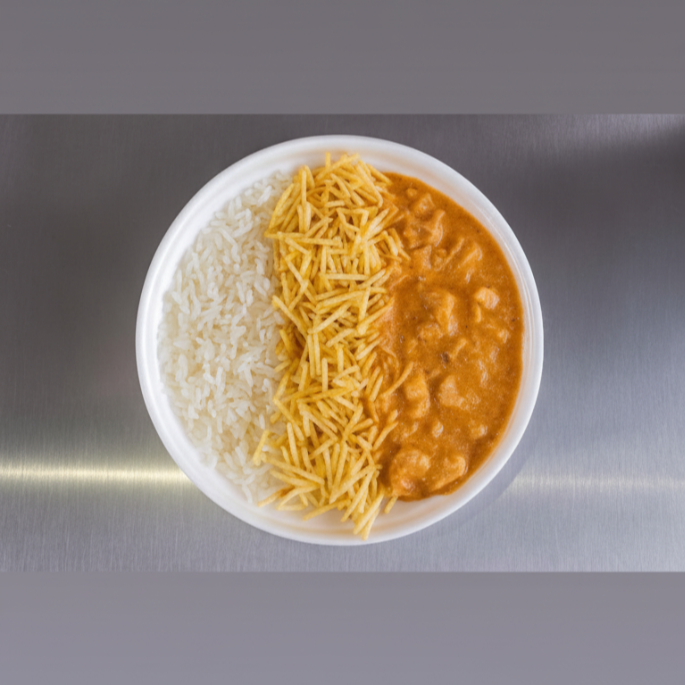 Marmita com delicioso filé de frango ao molho estrogonofe acompanhado de arroz branco e Batata palha. Marmita serve 1 pessoa