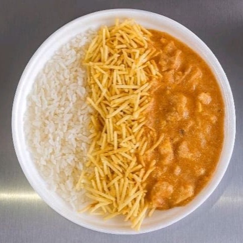 Marmita com delicioso strogonoff de frango preparada com arroz branco e Batata palha. Marmita indicada para 01 pessoa.