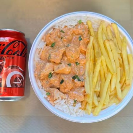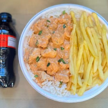 Marmita com delicioso filé de frango ao molho estrogonofe acompanhado de arroz branco e batatas fritas. Acompanha refrigerante pet Coca Cola bem gelado. Marmita indicada para 01 pessoa.