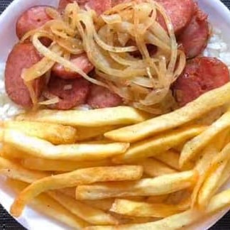 Calabresa aurora acebolada, Arroz e Fritas