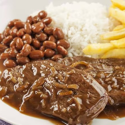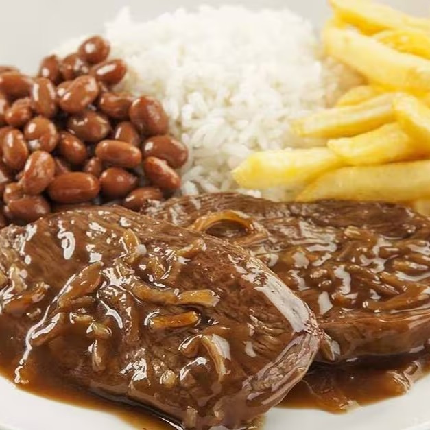 Nosso 'Especial do Dia' apresenta o magnifico bife acebolado, preparado com nosso tempero especial. Acompanha uma deliciosa combinação de arroz fresco, feijão caseiro e macarrão al dente, juntamente com a farofa crocante que é a nossa especialidade. Para fechar com chave de ouro, oferecemos uma seleção de legumes frescos e saudáveis, além da fritura do Dia, que pode variar entre a berinjela aveludada, batatas douradas e outros. (Foto Ilustrativa).