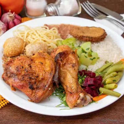 Acompanha: arroz, feijão, macarrão, legumes e frituras do Dia ( berinjela, batatas etc )(Foto Ilustrativa)