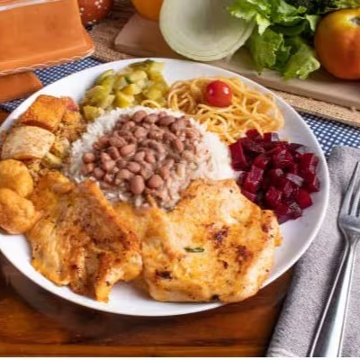 Acompanha arroz, feijão, macarrão, legumes, frituras do Dia e nosso delicioso file de frango grelhado.