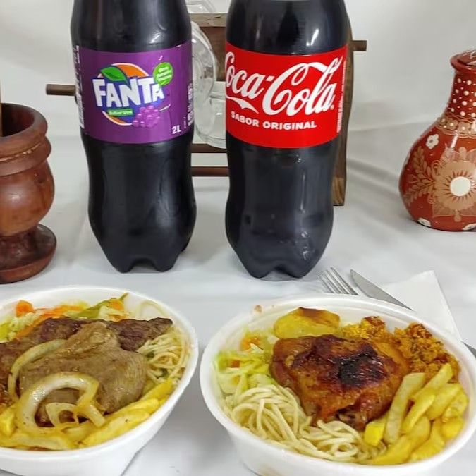 2 frango assado ( coxa ou sobrecoxa) com arroz, feijão, macarrão, legumes, frituras do Dia e uma coca de 600 ml